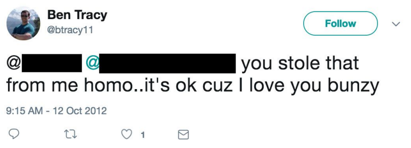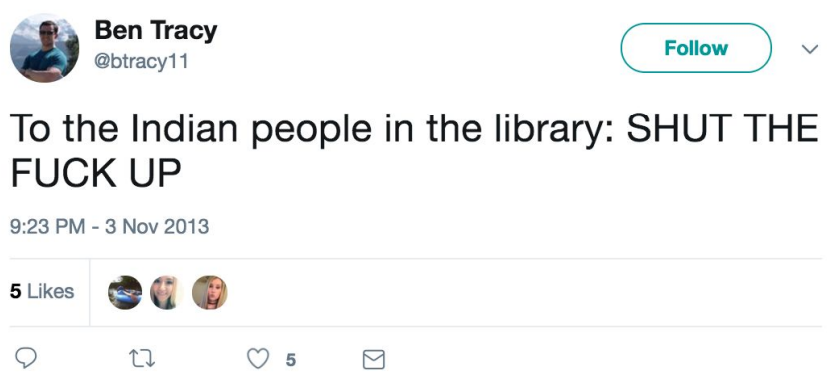 Among the most alarming tweets were those containing racially charged, homophobic, and sexually explicit language. In one tweet, Tracy wrote, “I’d f— her teeth straight.” In another, he targeted Indian students in a library, tweeting: “To the Indian people in the library: SHUT THE F— UP!” Other tweets showed him repeatedly using homophobic slurs, including one where he replied to a user, “I bet you liked that #fag,” after they described a traumatic experience. Several of his posts used the slur “faggot” in a derogatory manner.