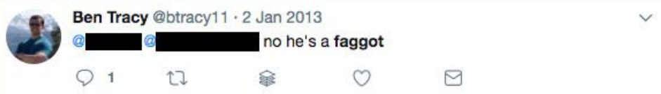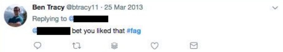 This tweet uses an explicit homophobic slur to insult someone, which is offensive and unacceptable. Language like this promotes hate and intolerance and has no place in any public or private setting. It reflects a serious lack of judgment and adds to the pattern of discriminatory behavior in Tracy’s posts.