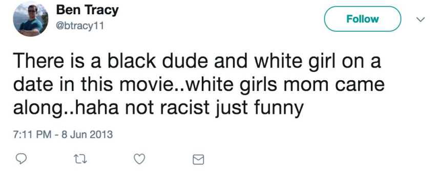 “There is a black dude and white girl on a date in this movie..white girls mom came along..haha not racist just funny”