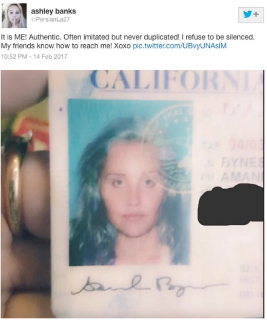 The account shares a photo of a California ID that appears to show Amanda Bynes, asserting the authenticity of the account and claiming control over her identity online.