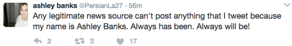 Any legitimate news source can’t post anything that I tweet because my name is Ashley Banks. Always has been. Always will be!