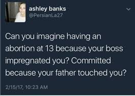 Can you imagine having an abortion at 13 because your boss impregnated you? Committed because your father touched you?