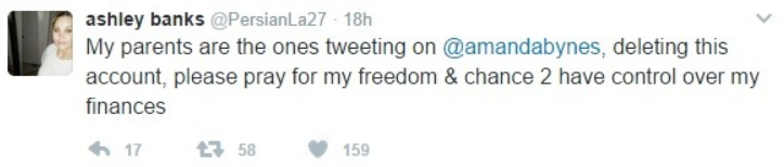 My parents are the ones tweeting on @amandabynes, deleting this account, please pray for my freedom & chance 2 have control over my finances