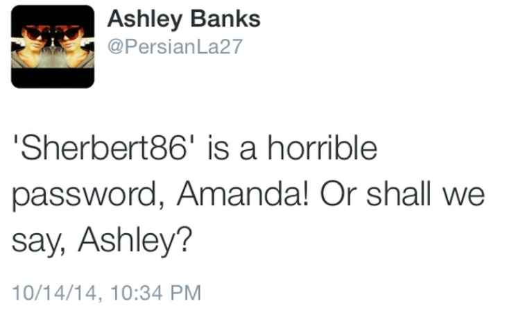 ‘Sherbert86’ is a horrible password, Amanda! Or shall we say, Ashley?