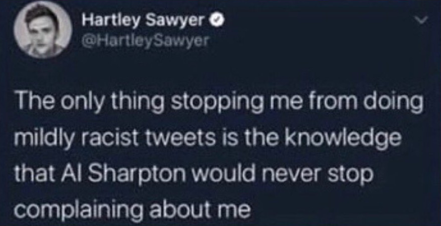 “The only thing stopping me from doing mildly racist tweets is the knowledge that Al Sharpton would never stop complaining about me”