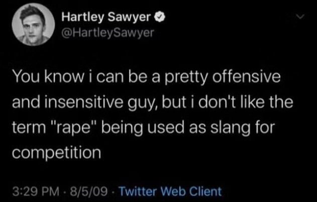 This tweet is paradoxical in the context of Sawyer’s other posts. While it criticizes casual use of the term “rape,” it’s inconsistent with his other tweets that make light of the subject.