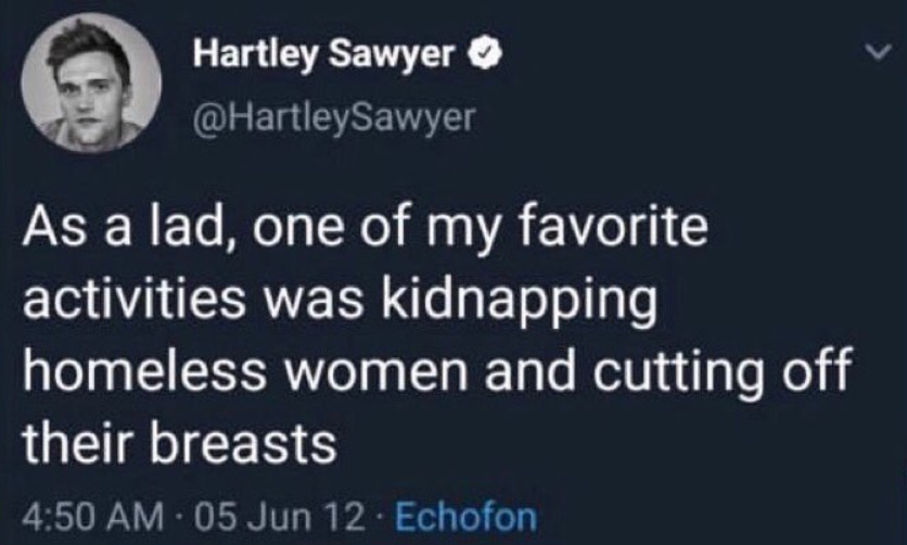 “As a lad, one of my favorite activities was kidnapping homeless women and cutting off their breasts”