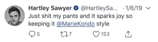 “Just shit my pants and it sparks joy so keeping it @MarieKondo style”