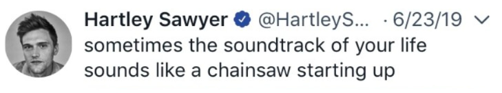 “sometimes the soundtrack of your life sounds like a chainsaw starting up”