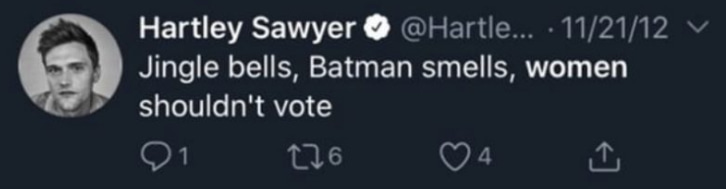Hartley Sawyer, best known for his role on The Flash, attracted serious attention when dozens of his old tweets resurfaced. Many of the posts were attempts at edgy humor, while others were crude, offensive, or inappropriate. Some tweets sparked backlash for comments involving race, gender, sexual violence, and other serious topics. This list includes 27 tweets that range from absurd and immature to disturbing. While a few seem intended to be funny, others clearly crossed lines.