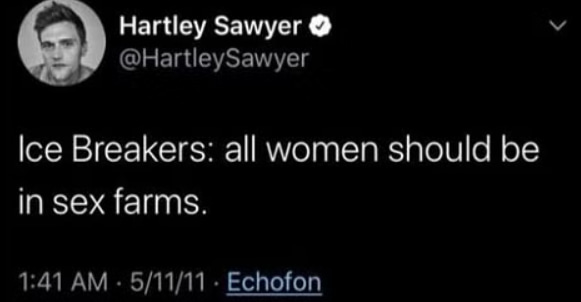 “Ice Breakers: all women should be in sex farms.”