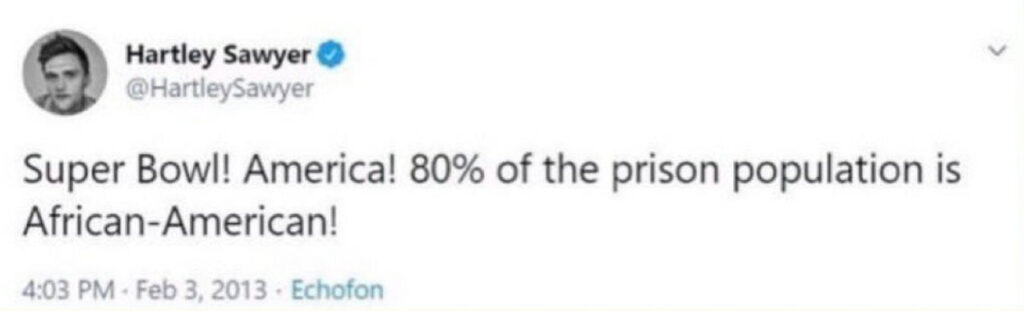 “Super Bowl! America! 80% of the prison population is African-American!”