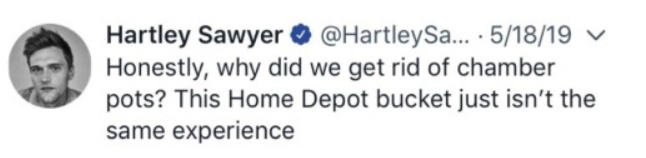 “Honestly, why did we get rid of chamber pots? This Home Depot bucket just isn’t the same experience”