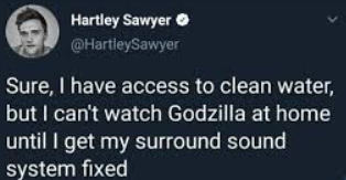 “Sure, I have access to clean water, but I can’t watch Godzilla at home until I get my surround sound system fixed”
