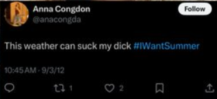 This tweet showcases vulgar and aggressive language over something as trivial as the weather. It reflects a pattern of posting publicly without any filter, raising questions about Congdon’s judgment and tone in social interactions online.