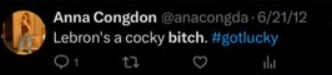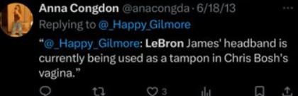 By reposting a misogynistic and degrading remark about NBA stars LeBron James and Chris Bosh, Congdon amplified a deeply offensive comment. Sharing such crude, sexist content further paints a troubling picture of her past behavior on social media.