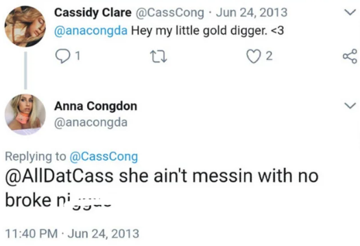 The tweets, which date back to 2012 and 2013, include multiple uses of the N-word and references to popular culture. One tweet reads, “#ReplaceADisneyMovieWithNa The Cheeta Na,” while others quote lyrics from Kanye West’s song “Gold Digger.” In response to being called a “gold digger,” she replied, “she ain’t messin with no broke n**s,” and later tweeted the same lyric again. Another post stated, “I thoroughly enjoy calling my mom n*a.”