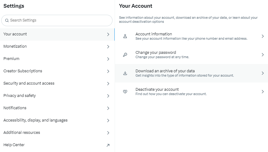 - Navigate to “Your Account,” then click on “Download an archive of your data”;