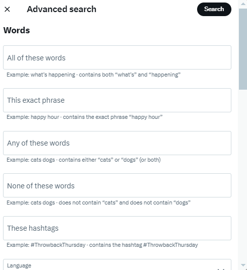 - All of these words: Finds tweets that match your search terms;