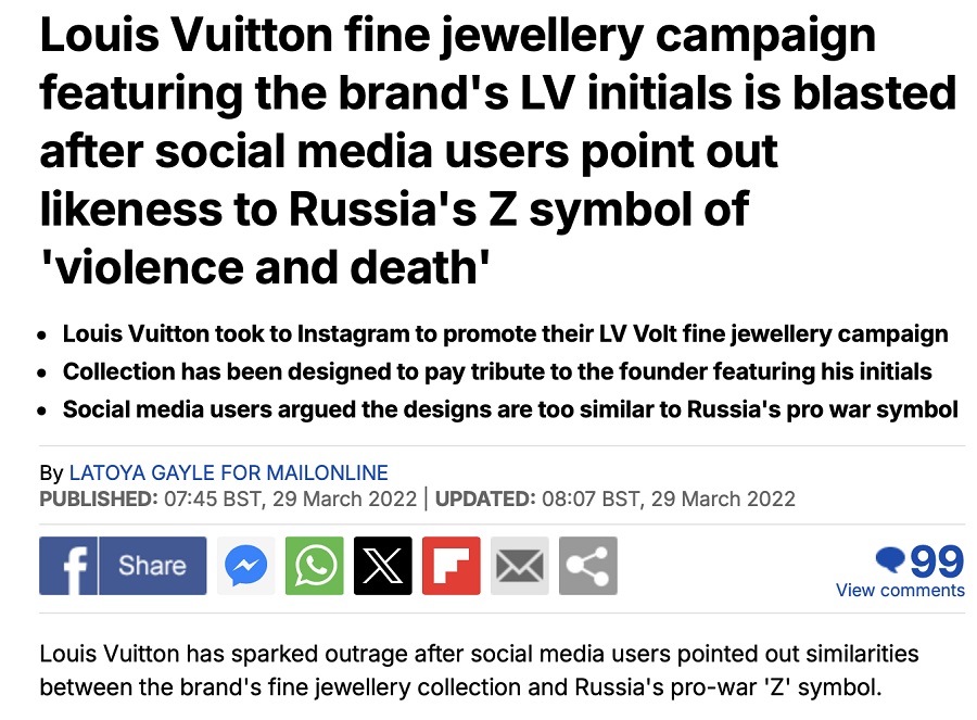 Take the case of Louis Vuitton at the beginning of the conflict in Ukraine—a real lesson for all brands. Right when a full-scale war broke out in Ukraine, and the symbol “Z” became associated with military aggression, Louis Vuitton released a post announcing a jewelry collection featuring the letter “Z” in its design. Seemed like a harmless release, but given the context, it sparked a storm of outrage among followers. Tanks marked with “Z” were crossing Ukraine’s borders, and the brand, not adjusting their post, found itself at the center of a scandal.