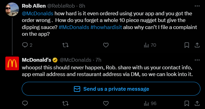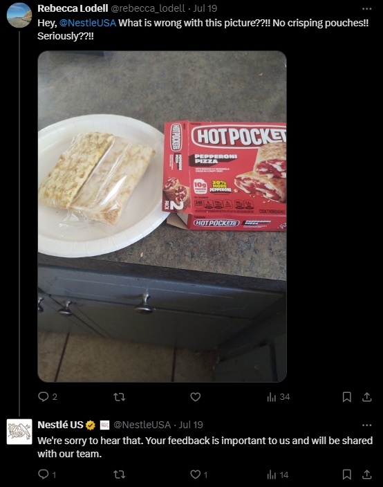 A customer tweeted to Nestlé, complaining about missing components in a Hot Pocket package. Nestlé responded quickly, expressing regret and promising to share the feedback with their team. Addressing such concerns publicly in a professional manner demonstrates your brand’s attentiveness and dedication to resolving issues.