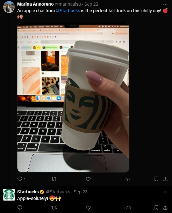 In a tweet, a Starbucks customer expressed their love for an apple chai, calling it the “perfect fall drink” on a chilly day. Starbucks responded with a lighthearted and fun reply, engaging with the customer and reinforcing the connection. This type of interaction can be shared as a testimonial on other platforms to reach a wider audience.