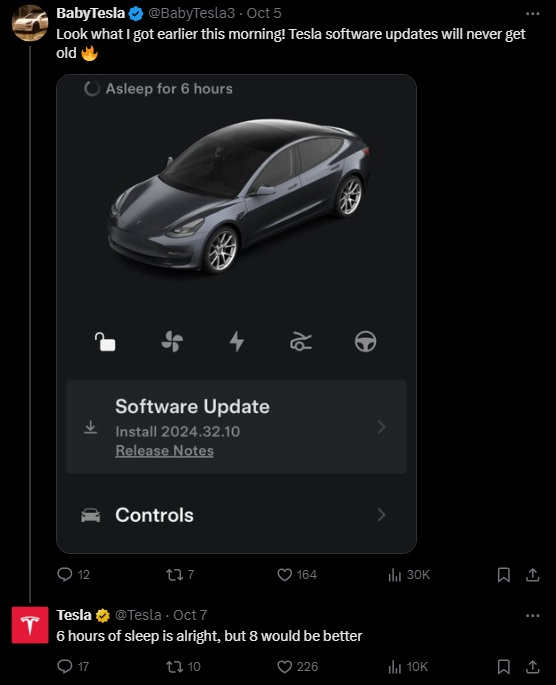 One example is a recent tweet from a Tesla customer who shared their excitement over a new software update, along with a screenshot. The customer praised Tesla for continually delivering fresh features. Tesla replied with a playful comment, recognizing the customer’s enthusiasm while also humorously advising them to get some rest, further engaging with the fanbase.