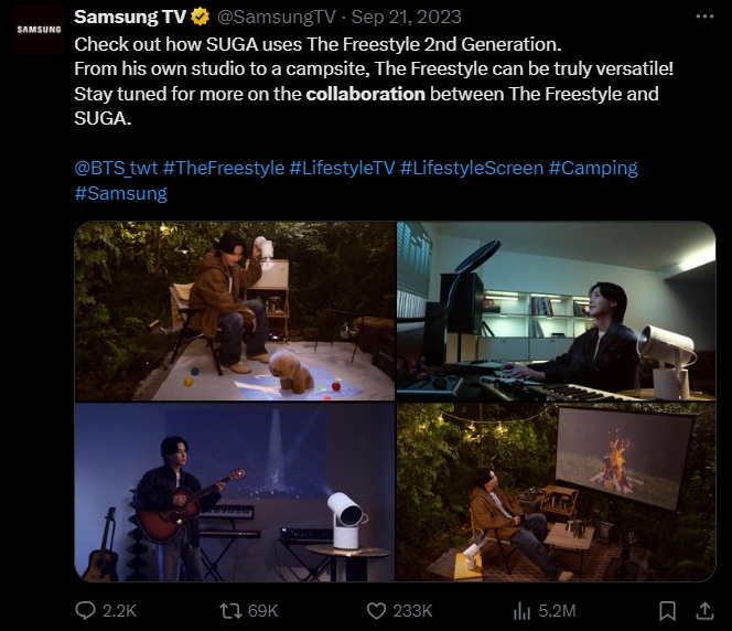 Samsung recently collaborated with SUGA of BTS to promote their Freestyle 2nd Generation product. In a tweet, Samsung highlighted the versatility of the product by showing SUGA using it both in his studio and at a campsite. This partnership helps Samsung connect with BTS’s large fanbase while demonstrating how the product can be used in different settings. The collaboration makes sense, as SUGA is already a well-known artist and influencer.